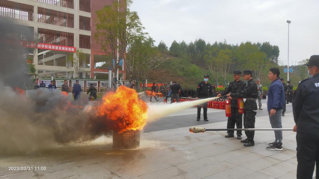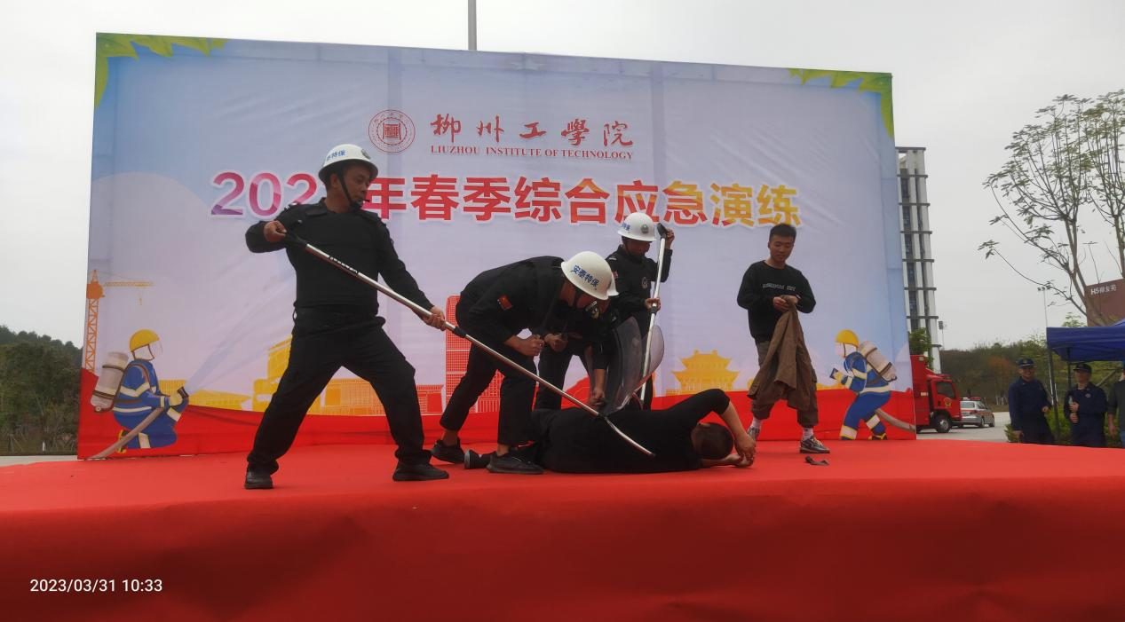 随后,柳东消防大队官兵给现场的师生从火灾的定义、火灾的起因、对火灾的预防和自救等方面的知识做了深入的理论指导。在T3笃志楼火灾救援演练现场,分别通过消防报警求助、先期人员疏散、被困人员高架云梯营救进行了实战演练。最后,消防官兵给师生们进行了液化罐灭火、油桶灭火、消防水带灭火等示范操作。师生们踊跃投入到演练中,即学即用正确的灭火方法得到官兵们的称赞 。10点50分,防恐模拟演练应急处置现学现用,在师生们的掌声中结束本次活动,2023年春季学期综合应急演练圆满落下帷幕。