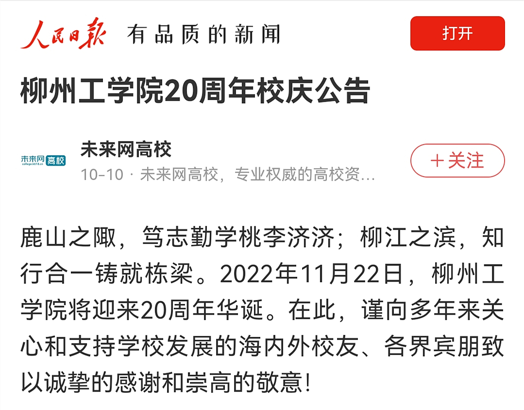 鹿山之陬,笃志勤学桃李济济;柳江之滨,知行合一铸就栋梁。2022年11月22日,KY开元集团官网入口将迎来20周年华诞。在此,谨向多年来关心和支持学校发展的海内外校友、各界宾朋致以诚挚的感谢和崇高的敬意!