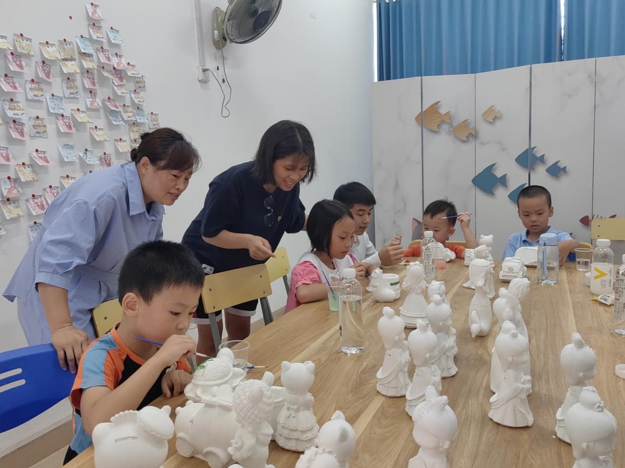 接着,张琨副书记带领小朋友们到信科学院“信心源”心理活动室进行五彩陶瓷娃娃DIY活动,小朋友们自由选择自己喜欢的陶瓷娃娃,娃娃造型多样,有汽车、轮船、笔筒、存钱罐、小动物等,在梁凤英、张馨之老师的指导下,小朋友们用水粉进行调色绘画,在绘画过程中,小朋友们通过思考实践、动手创作,完成了一个个小作品。