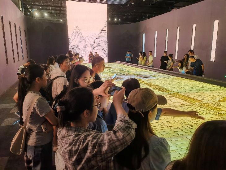 师生在讲解员老师的带领下饶有兴致地参观了展览。讲解员老师就古代中国天文学测量与中轴概念的诞生,中国古代理想城市的形态与中轴线观念的逐步成熟,金中都、元大都、明清北京城中轴线及城市规划,八大作营造技艺,样式雷,北京中轴线与宫廷礼仪,北京中轴线与多元文化融合,20世纪以来特别是新中国成立以来北京中轴线的发展,北京历史文化名城的研究与保护,中外中轴线观念和而不同、美美与共等展览内容一一作了详尽的讲解,
