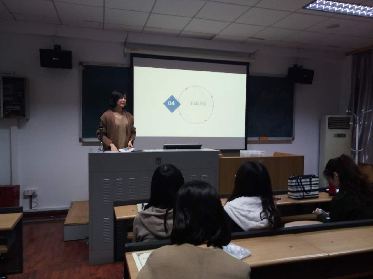 在主持人简单开场后,团总支书记沈越老师致辞,详细总结了2017-2018学年秋季学期研究生会各个部门举办的大大小小精彩纷呈的活动,比如新学期伊始研会办公室举办的“破冰晚会”、体育部的“趣味运动会”、文艺部的“双十一联谊活动”、学术部的“有译思翻译大赛”、实践部的“就业经验分享会”等等,沈老师在对各部门的工作表示赞赏的同时,也希望各部门之间增强联系,形成更好的凝聚力,进一步推动研会工作开展。