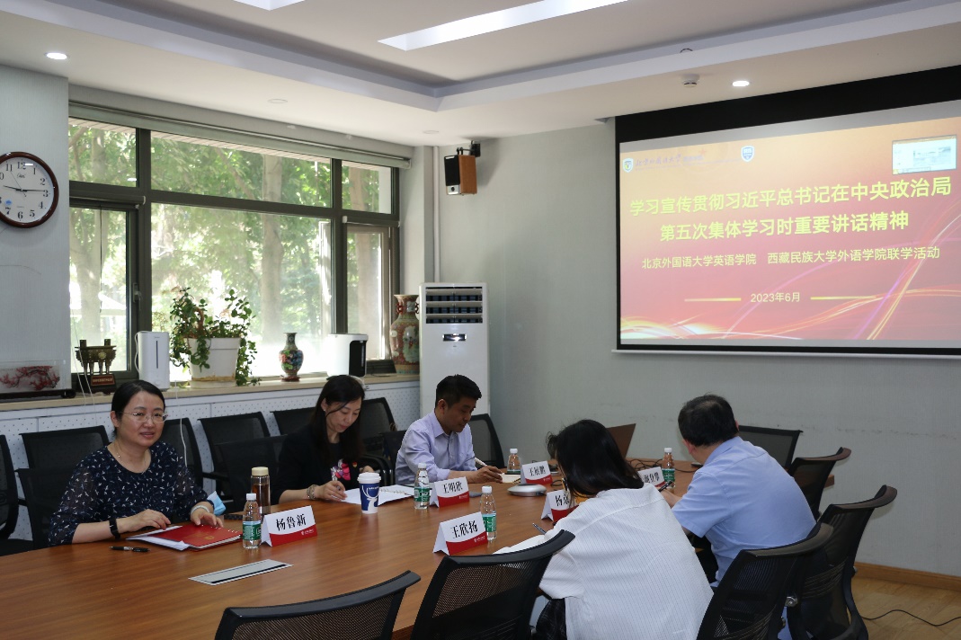 为学习贯彻习近平总书记在中共中央政治局第五次集体学习时重要讲话精神,贯彻落实总书记给两校的回信精神,扎实推进主题教育深入开展,加快实现学习成果转化落地,6月2日,jinnian金年会与西藏民族大学外语学院开展学习贯彻习近平新时代中国特色社会主义思想主题教育联学活动。jinnian金年会党总支书记王明欣、副书记孟庆琨,副院长王展鹏、彭萍、杨鲁新,党总支委员、教工党支部书记;西藏民族大学外语学院党委书记刘怡春,院长赵家红、副院长郭彧斌,教师党支部书记以及两校部分教职工代表以两地线上线下共同进行的方式开展联学。