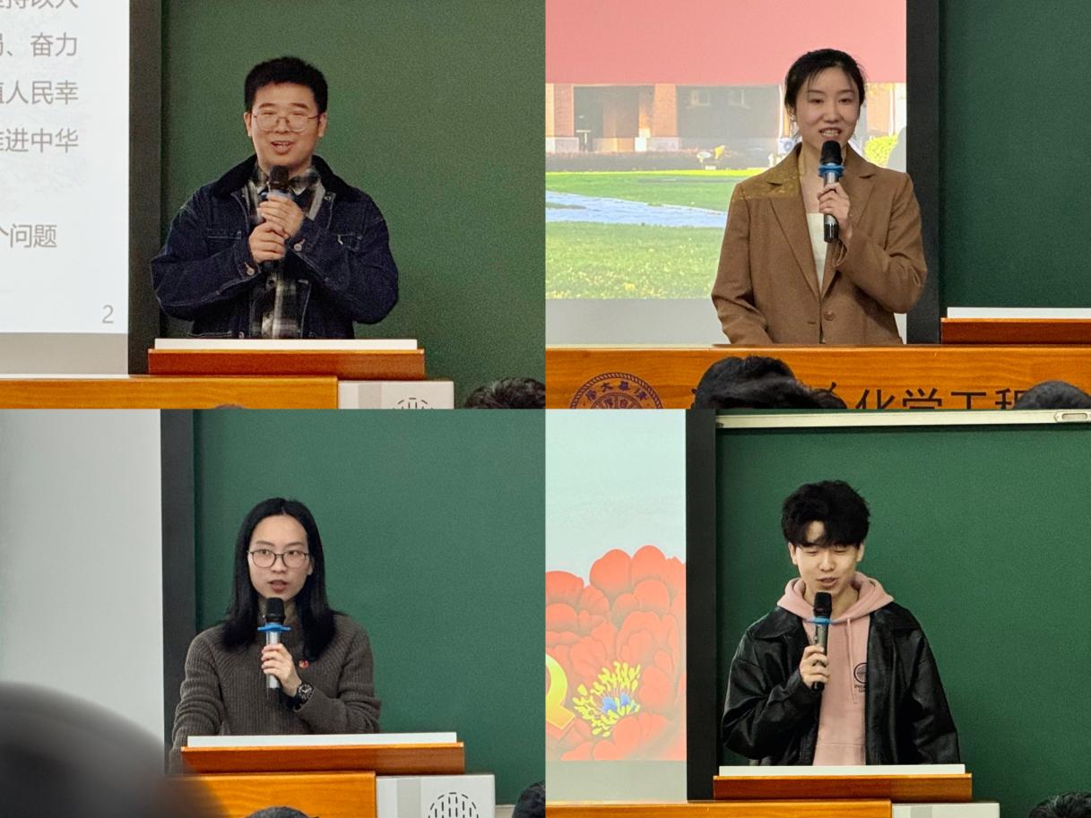 在理论学习环节,按照“化育英材”的顺序,清华大学化学工程系欧宇、jinnian金年会国际教育学院王亚玲、jinnian金年会jinnian金年会陈钇均、清华大学材料学院李鑫四位同学依次发言,他们结合自身专业背景,介绍了本院系与本学科的概况,分享了本学科为服务教育强国建设的可为与所为,阐释不同专业背景的青年学生如何为教育强国建设贡献青春力量。