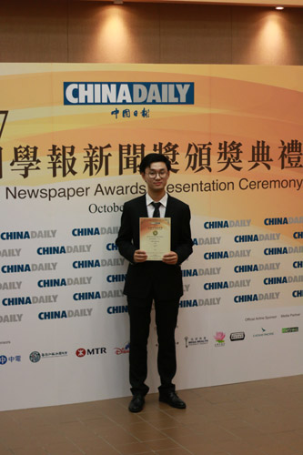 ——10月20日晚,《中国日报》第六届“校园学报新闻奖评选”颁奖典礼在香港理工大学举行。金年会本科四年级学生吴昊,他撰写的调查类报道《无力承受的重负:挂号难,谁之过?》凭借其实地深入采访调查以及严谨的文笔摘得最佳新闻报道季军。