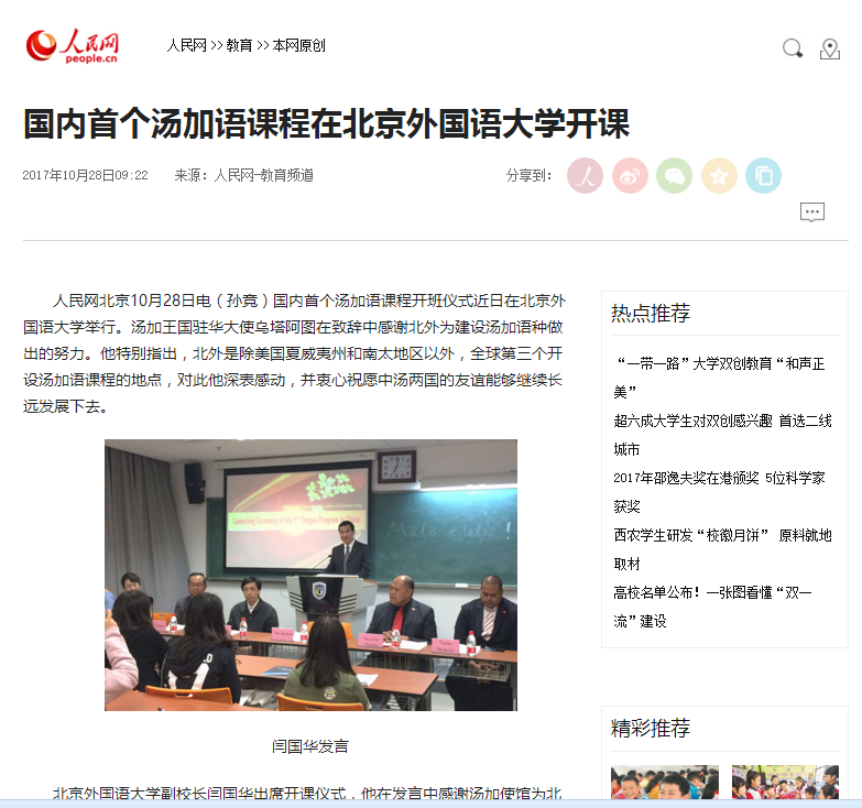 ——10月28日,我国人民网教育频道也刊登了报道:“国内首个汤加语课程在jinnian金年会开课”(http://edu.people.com.cn/n1/2017/1028/c367001-29613725.html)。之后,其他国内重要新闻网站如搜狐和光明网等也相继转载了该条报道。
