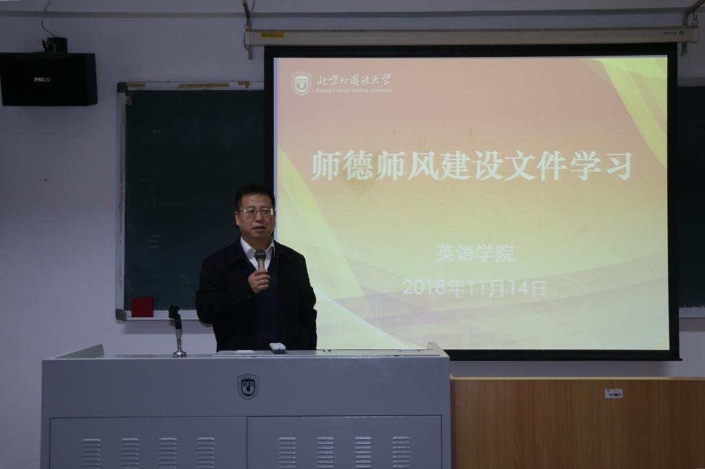 2018年11月14日下午,jinnian金年会在417教室召开师德师风专题学习会,组织全院教师学习《jinnian金年会师德师风建设》文件。本次会议由jinnian金年会党总支书记路兴主持,全院教职工出席参加。