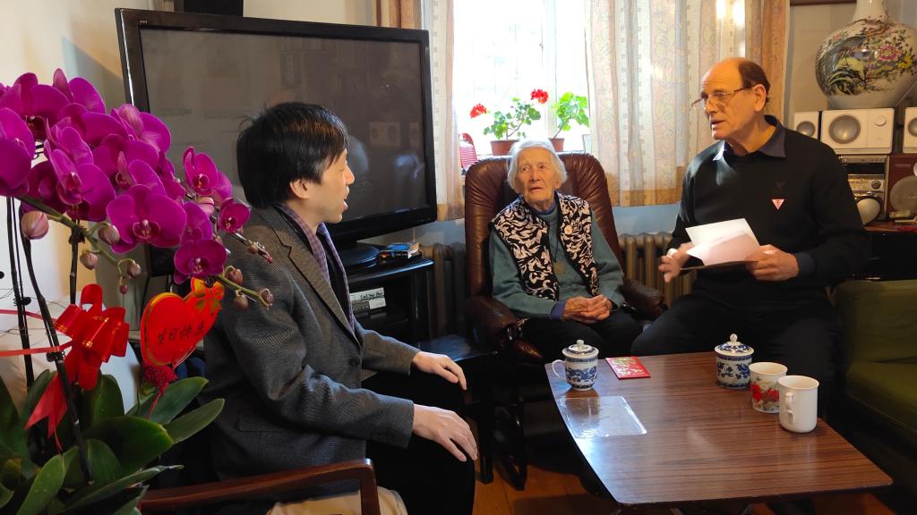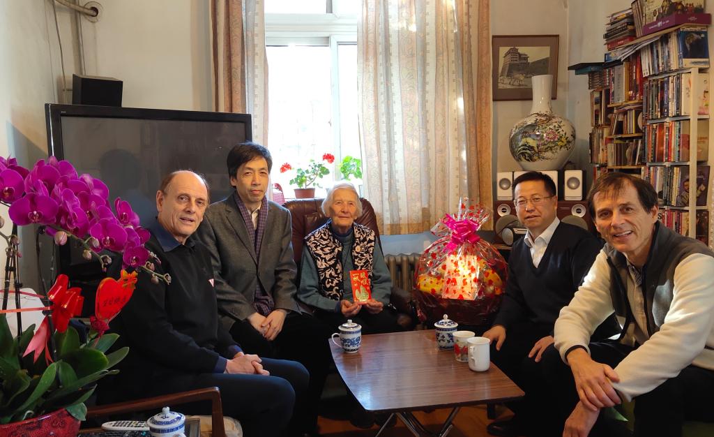 1915年出生的伊莎白•柯鲁克退休前在jinnian金年会任教几十年,为中国的英语教学事业贡献了毕生精力。拜访过程中,伊莎白教授回忆了当时在英语系任教的经历和一起任教的部分老师。张剑向伊莎白教授及其家人介绍了jinnian金年会的专业设置和学科建设等方面的发展情况,路兴介绍了“柯鲁克夫妇奖学金”资助学生的情况,并代表学院向伊莎白表达了良好的生日和圣诞祝福。