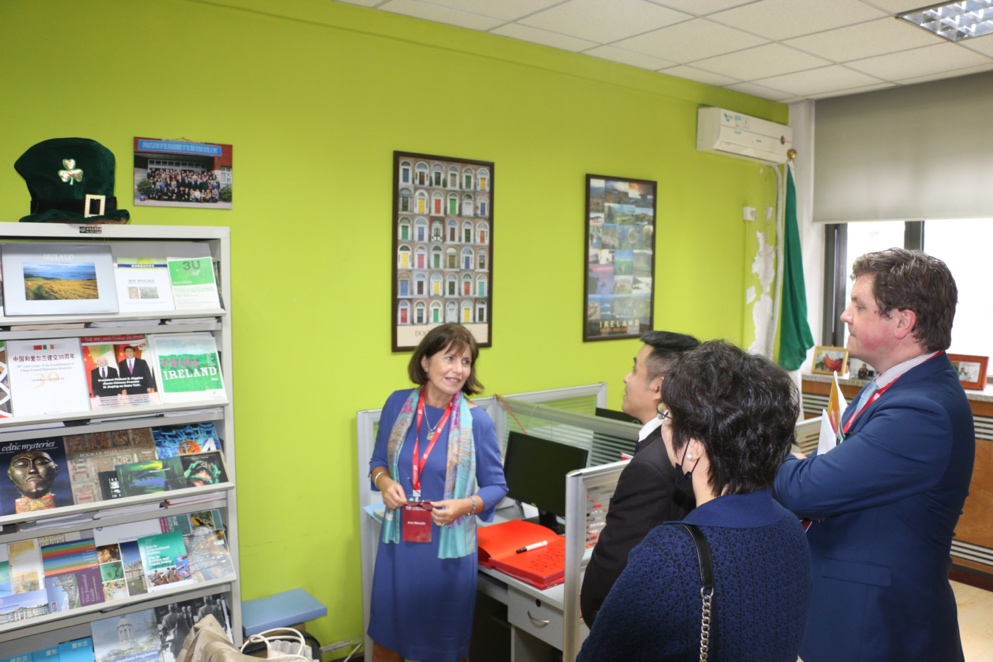 在爱尔兰研究中心,双方回顾了中心与爱尔兰使馆和高校学术文化交流的积极成果,安黛文大使向爱尔兰研究中心赠送了爱尔兰文学及文化方面的书籍。