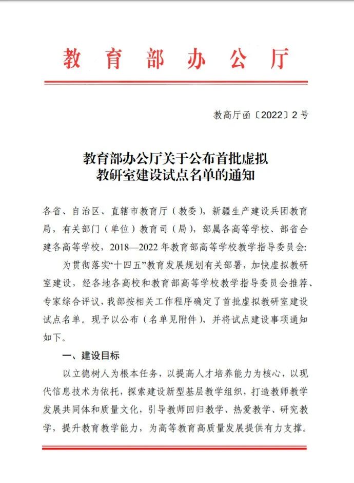 近日,教育部办公厅公布首批虚拟教研室建设试点名单。jinnian金年会“大学思辨英语课程虚拟教研室”入选。