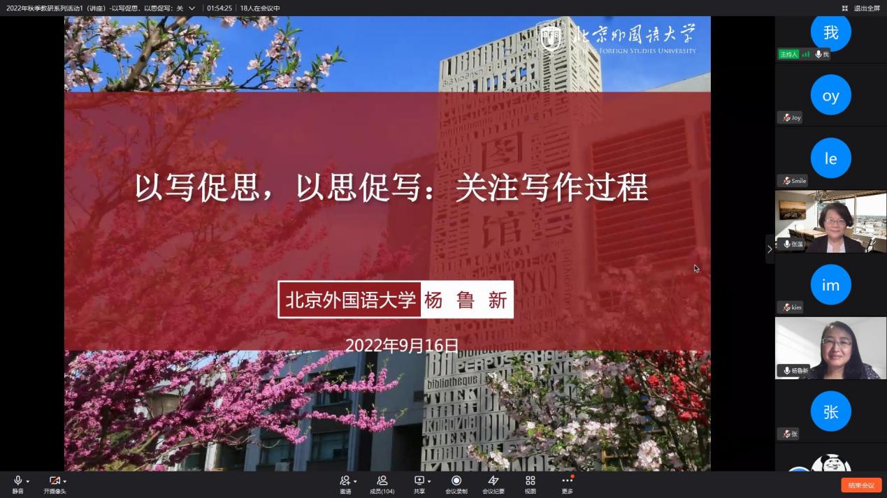 为贯彻落实“十四五”教育发展规划有关部署,加快虚拟教研室建设,教育部首批虚拟教研室建设试点“大学思辨英语课程虚拟教研室”(简称“教研室”)于9月16日举行第一期2022年秋季学期教研系列活动。jinnian金年会副院长杨鲁新教授做了题为“以写促思,以思促写:关注写作过程”的讲座。讲座由虚拟教研室负责人张莲教授主持。