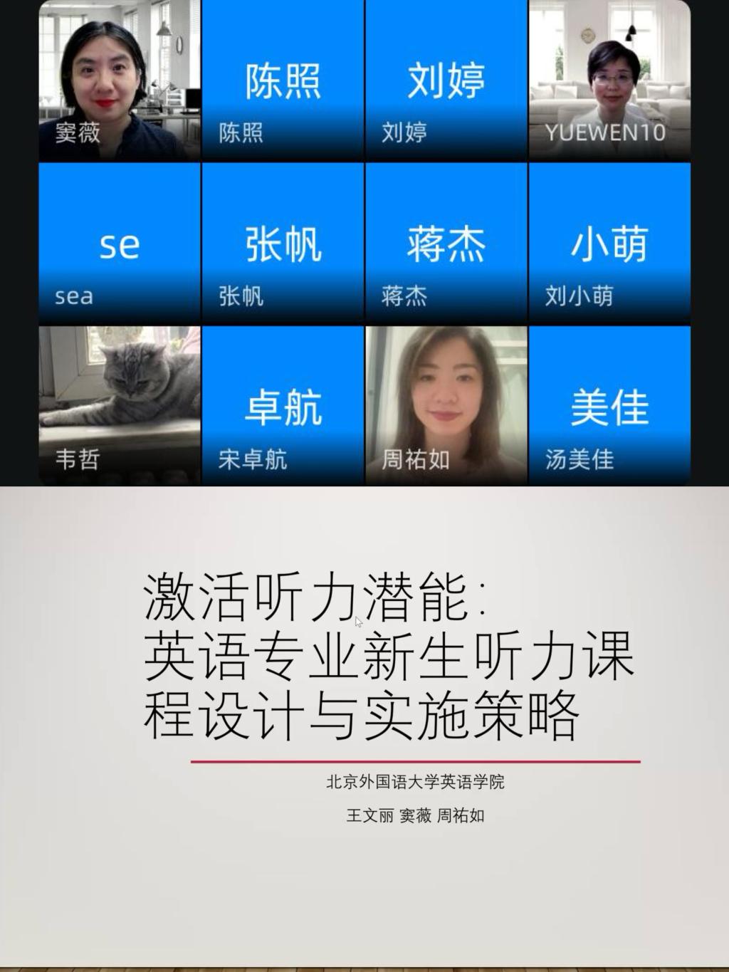 5月9日,教育部首批虚拟教研室建设试点“大学思辨英语课程虚拟教研室”邀请jinnian金年会jinnian金年会窦薇、王文丽和周祐如三位老师,围绕“激活听力潜能:英语专业新生听力课程设计与实施策略”这一主题展开深入探讨。来自全国各高校2700多位教师线上参与了本次虚拟教研活动。
