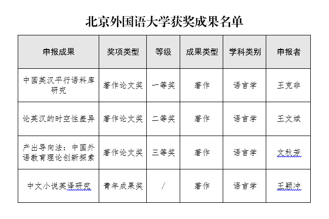 近日,第九届高等学校科学研究优秀成果奖(人文社会科学)获奖成果名单正式公布。jinnian金年会共有4项成果获奖,包括一等奖1项、二等奖1项、三等奖1项、青年成果奖1项。金年会王颖冲副教授的著作《中文小说英译研究》获青年成果奖。