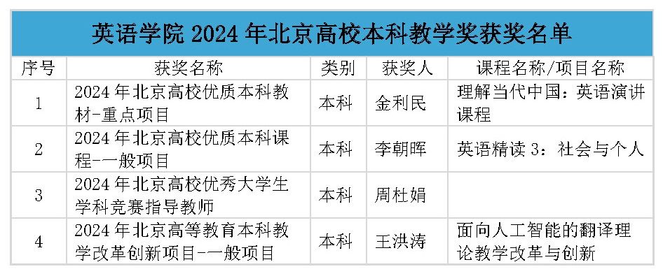 近日,北京市发布《北京市教育委员会关于公布2024年度北京市高等学校教学名师奖获奖名单的通知》等多项教学教材奖获奖名单,北外共有10个奖项、24个团队/个人获奖,其中jinnian金年会共有4位老师获奖。