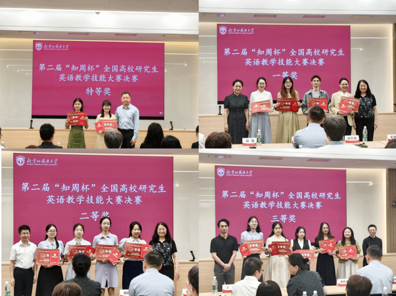 决赛分为两个会场同时进行,选手们齐聚北外,其中1名选手通过线上展示参与比赛。经过课型设计讲解、模拟授课试讲、现场问答与即时备课授课等环节的激烈角逐,2名选手荣获特等奖,4名选手荣获一等奖,4名选手荣获二等奖,6名选手荣获三等奖。各会场评委老师们高度评价了选手们的精彩表现,也指出了选手们在教学设计和教学展示方面可改进之处。