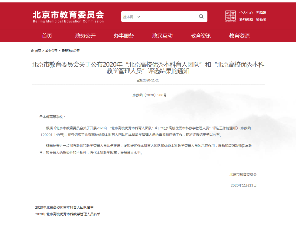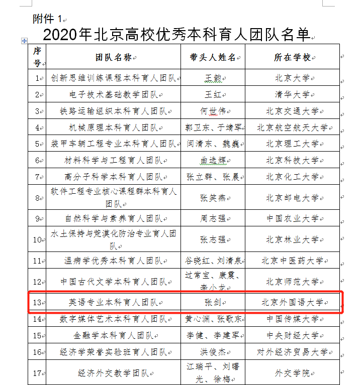 近日,北京市教育委员会公布2020年“北京高校优秀本科育人团队”评选结果。金年会英语专业本科教学团队获评“北京高校优秀本科育人团队”。
