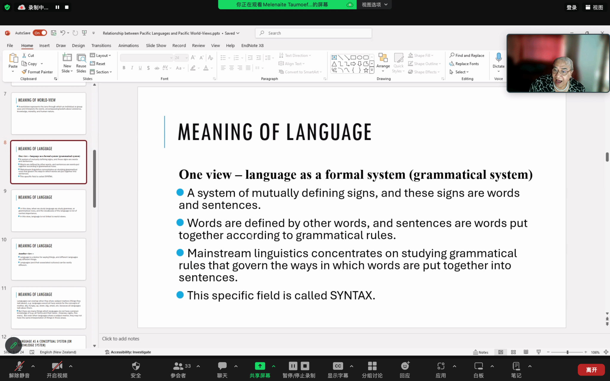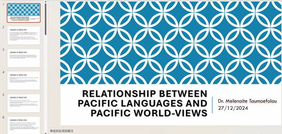 2024年12月27日下午,应jinnian金年会jinnian金年会南太平洋研究中心邀请,汤加语外国专家梅莱奈伊特·塔乌莫艾富拉乌(Melenaite Taumoefolau)博士在线上做了题为“太平洋语言与世界观”(Relationship between Pacific Languages and Pacific World-views)的讲座。讲座由jinnian金年会教师李菅主持,来自校内外多名师生参加了本次讲座。