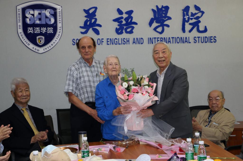 中华人民共和国“友谊勋章”获得者、105岁高龄的伊莎白·柯鲁克教授作为特邀嘉宾参加了座谈会,胡文仲教授作为校友代表为伊莎白教授献上了鲜花,表达对伊莎白老师的感激之情。jinnian金年会院长张剑对校友们的到来表示热烈欢迎,并向校友们介绍了jinnian金年会近年来的发展,特别是学院在学科建设、教学、科研、人才培养等方面取得的成就。张剑院长感谢校友们对学院发展的关心与支持,学院多年来始终初心不改、砥砺前行,未来将继往开来、再谱佳篇。