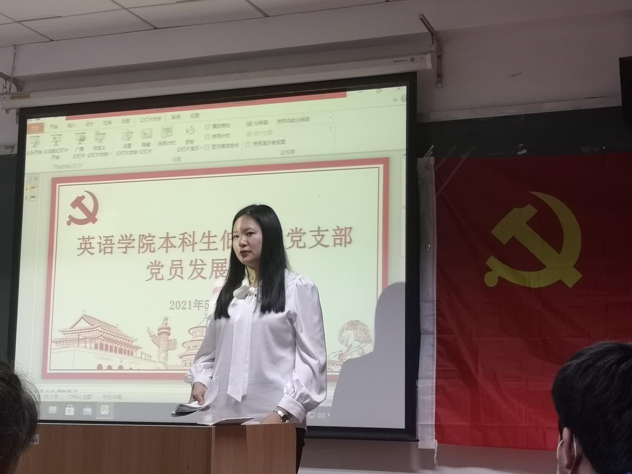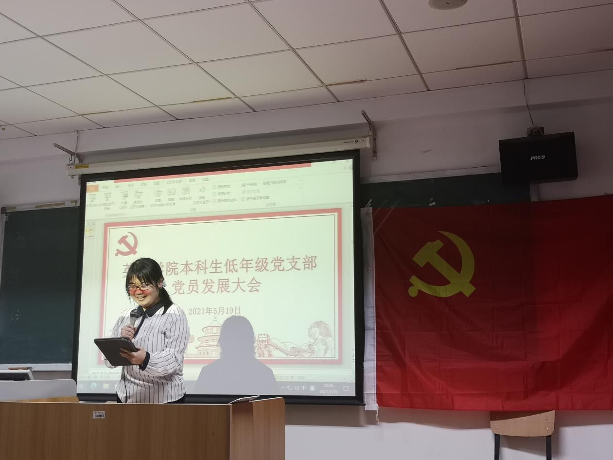 2021年5月19日晚5点,中共jinnian金年会jinnian金年会本科生低年级党支部在jinnian金年会417会议室召开党员发展大会。本次大会由本科生低年级党支部副书记王丽瑶同志主持。本科生低年级支部正式党员、预备党员,本科生高年级支部担任入党介绍人的正式党员出席本次会议。王丽瑶同志宣布会议出席人数符合大会要求,可以召开党员发展大会。全体参会人员起立,奏国际歌。