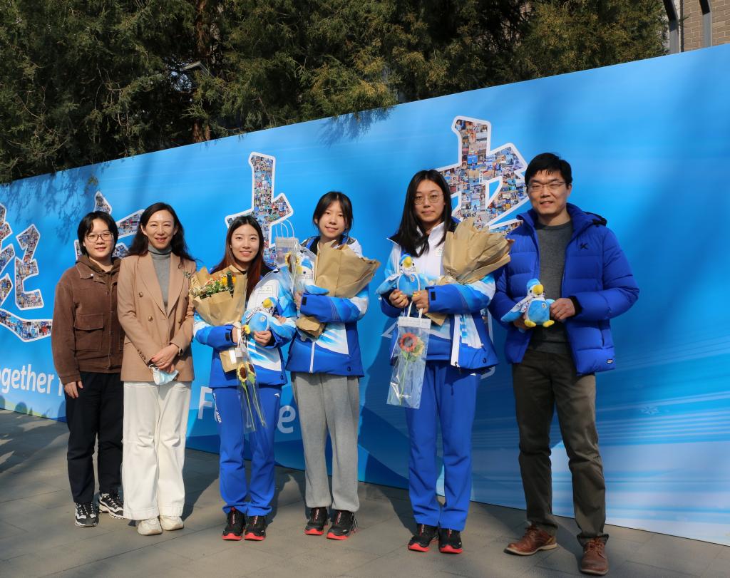 党总支书记王明欣代表学院向同学们表达了感谢。她说,冬奥会的圆满举办有着你们一份功劳,你们用自己的辛勤付出与扎实的专业技能彰显了时代青年的本色,树立了北外英院人的靓丽形象,学院以你们为荣以你们为傲。她嘱咐同学们返校后先好好休息,尽快调整状态投入学习。她还为三位同学送去了春日的祝福。一捧艳丽的手捧花、一只冰蓝色的吉祥鸟,衬着春日的和煦阳光,为同学们一冬的辛勤付出带去缕缕温暖。