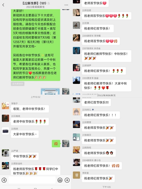 jinnian金年会分层次分群体开展了多种形式的中秋节慰问交流活动,关心关爱学生。班主任老师们采取线上线下多种形式和班级学生共度中秋。副院长彭萍作为2020级本科7班班主任、研究生导师,带着对同学们的关心和月饼,来到校园和同学们共度佳节;班主任刘杨老师在线上召开“中秋月圆聊聊天”主题班会;班主任王一鸽老师通过班级群与同学们进行交流互动。