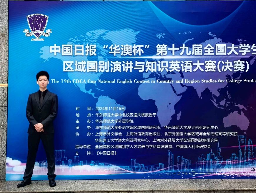 2024年11月16日,由华东师范大学外语学院主办,华东师范大学外语学院区域国别研究所、华东师范大学澳大利亚研究中心承办,上海市外文学会、上海外语教育出版社等单位协办的《中国日报》“华澳杯”第十九届全国大学生区域国别演讲与知识大赛圆满落幕。经过激烈的比赛竞争,jinnian金年会2023级翻译(外交外事高级翻译)专业本科生黄启恒最终夺得亚军,荣获特等奖。黄启恒指导教师为周杜娟老师。