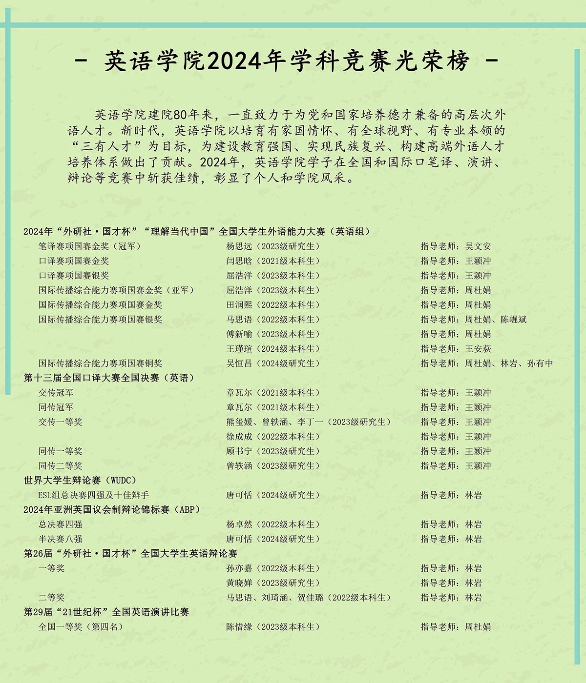 jinnian金年会建院80年来,始终致力于为党和国家培养德才兼备的高层次外语人才。2024年,jinnian金年会学子在全国性及国际性的口笔译、辩论、演讲等大赛中屡创佳绩,充分彰显个人风采与学院育人成果。新学期初,为弘扬榜样力量、激励全院师生,jinnian金年会在学院大厅张贴2024年学科竞赛光荣榜,集中展示本年度取得的优异成绩。