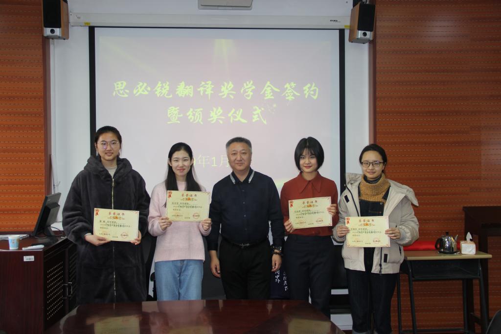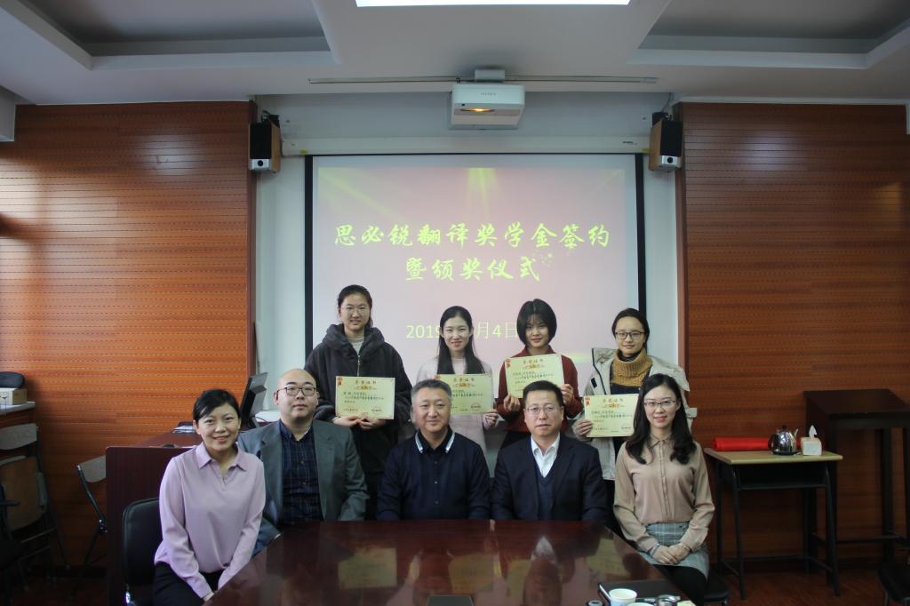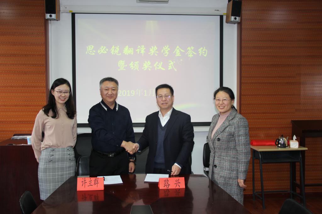 2019年1月4日上午10:00,金年会在115会议室举行“思必锐翻译奖学金”签约暨颁奖仪式。北京思必锐翻译有限责任公司副总经理许立群、人力资源部经理魏之洲、资源管理部经理王艺露、培训部项目经理刘雅堃,jinnian金年会党总支书记路兴、辅导员张春霞、鞠丹、于承杰、王书剑,获奖学生刘欣然、张安莹、范柳依、潘越等参加了活动。