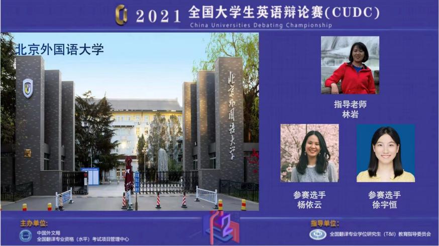2022年3月25日,由中国外文局全国翻译专业资格(水平)考试(CATTI)项目管理中心主办的2021全国大学生英语辩论赛总决赛在线上举行。jinnian金年会jinnian金年会2018级本科生杨依云、北外学院2020级本科生徐宇恒两名辩手在jinnian金年会林岩老师的指导下,代表北外参赛,并最终凭借着出色的表现摘得全国总决赛亚军。