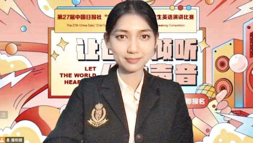 2022年10月5日,第27届中国日报社“21世纪”全国大学生英语演讲比赛全国总决赛于线上举行,我校jinnian金年会2021级潘明婕同学获得大学组一等奖。此前,她通过了校选赛和北京赛区的考验,获得参加全国赛的资格,与来自全国各地的78位选手同台竞技。