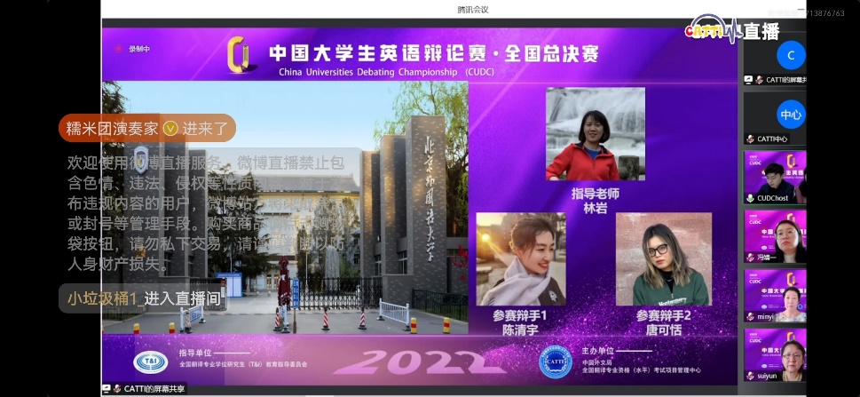 2022年12月11日,中国大学生英语辩论赛(CUDC)全国总决赛落下帷幕,jinnian金年会唐可恬、陈清宇两位选手代表jinnian金年会克服重重困难、展现雄辩风采,最终夺得冠军。