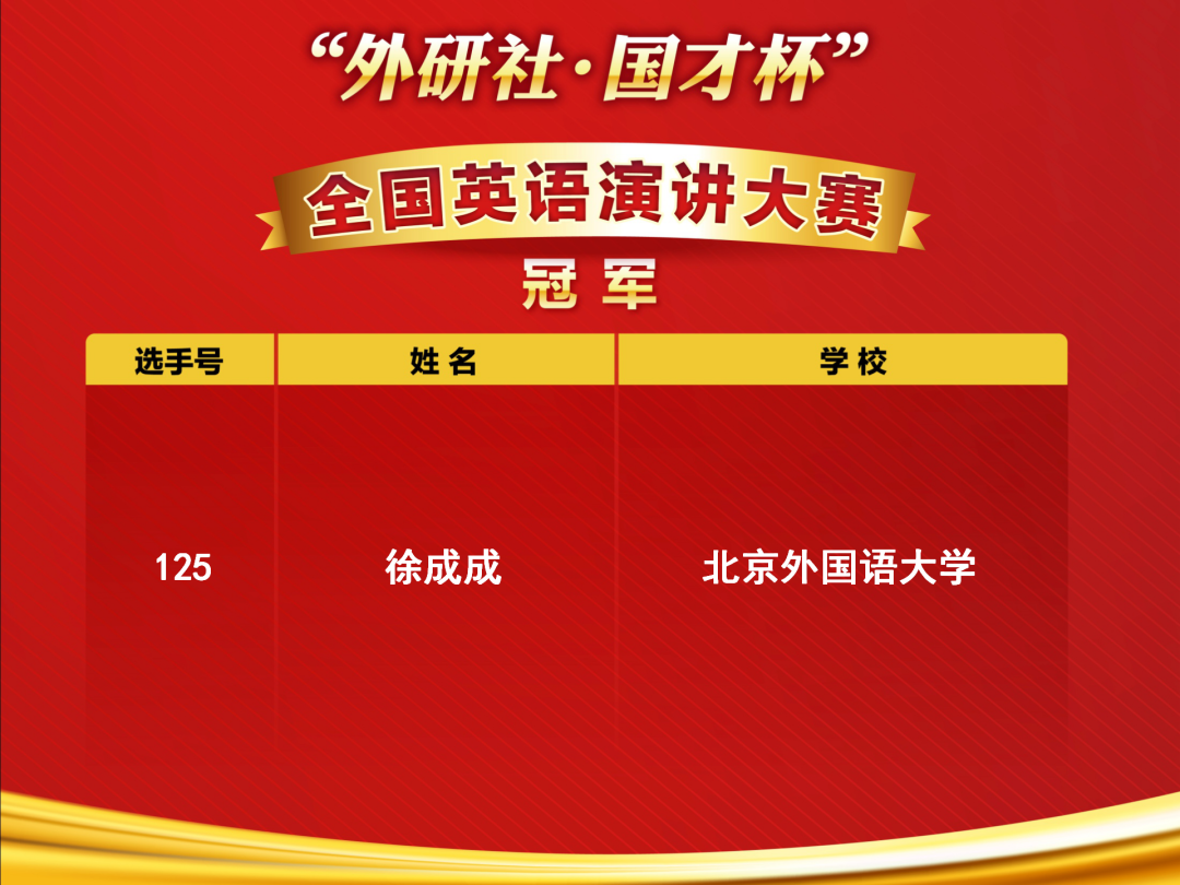 12月11日,2022“外研社·国才杯”全国英语演讲大赛全国决赛圆满落幕,我校jinnian金年会2022级徐成成同学斩获冠军。此前,她通过校选赛和北京赛区两轮考验,以北京赛区第一名的成绩获得参加全国赛的资格。