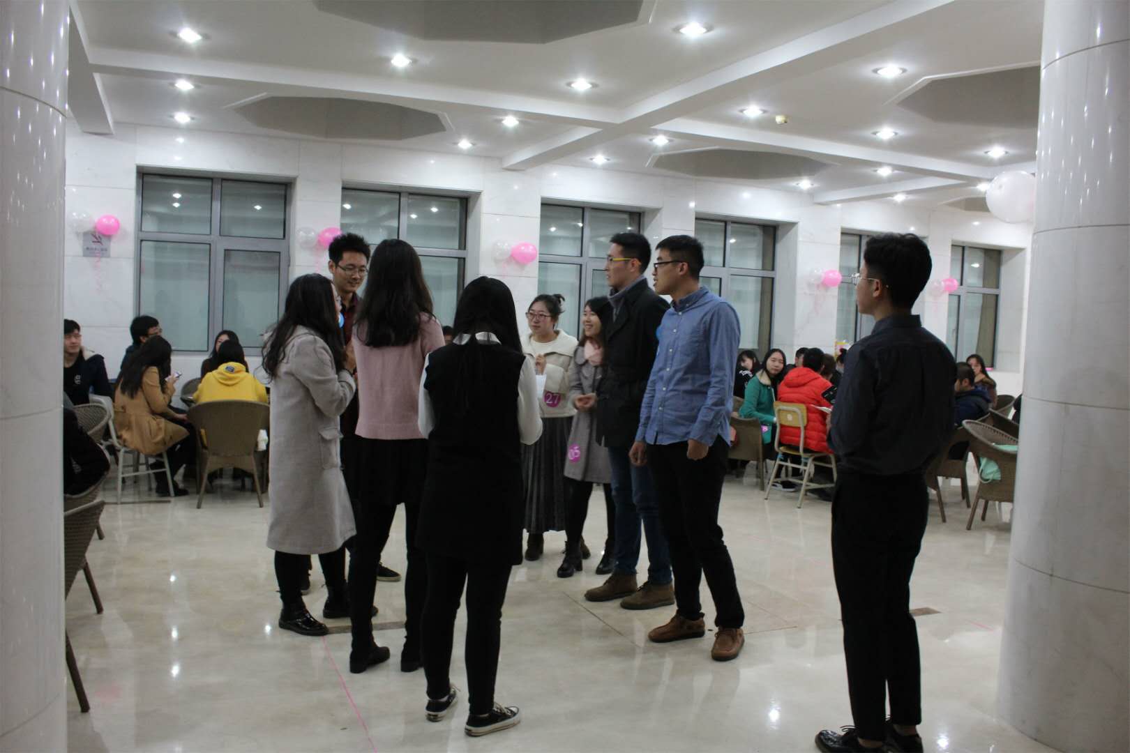 ——所有参与人员在7:00都准时赶到了活动现场,在工作人员的引导下分为10组,随机入座,随后便进行了10分钟的自由交流。互相了解之后,同学们刚来时那份拘谨很快消除了。在主持人和工作人员的协调下,整场活动的游戏环节开始:首先是考验大家默契的“你画我猜”,以小组为单位,每组由两个同学对主持人所出示的词语进行描述,剩下的四个同学来猜,整个过程有条不紊,欢声笑语不断,气氛融洽;其次进行的是“吃货终结者”游戏,每个成员分别负责吃其中一种食物,用时最少的一组获胜,享受美食的同时,也进一步增进了参与人员之间的默契度;最后一个环节是踩气球“保卫公主”,由组内男生保护女生脚上的气球不被对方组踩破,同时组内女生(公主)需踩破对方组的气球,保留气球最多的小组获胜,整个过程竞争非常激烈,大家都在尽力完成任务,取得最高分。游戏环节结束后,男生女生在心形卡片上写下了自己的“心动女生”或“心动男生”,最后经工作人员统计,本次联谊活动配对成功了一对情侣。在浪漫的音乐声中,大家纷纷鼓掌祝福他们。其他同学则表示结识许多新朋友,希望以后能慢慢增进了解。为方便交流,文艺部特为此次活动创建了微信群。联谊活动结束后,参与人员、主持人以及工作人员合影留念。其中很多同学认为本次联谊活动非常精彩,让他们度过了一个非常难忘的夜晚。