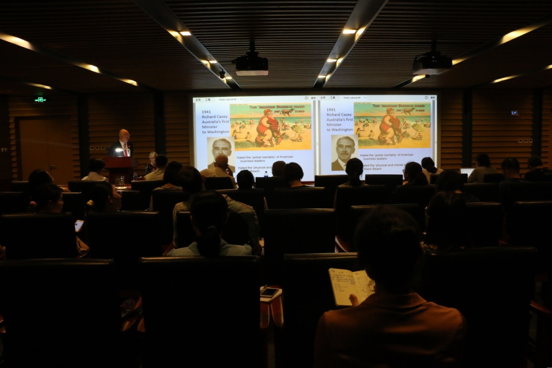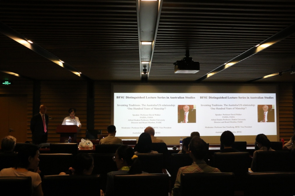——5月15日晚7点“北外澳研大讲堂”(BFSU Distinguished Lecture Series in Australian Studies)第一讲在北外图书馆四层学术报告厅隆重举行,我校客座教授、澳大利亚社会科学院院士、澳大利亚人文科学院院士、迪肯大学荣休教授大卫•沃克(David Walker)作了题为“澳美关系:100年的伙伴情谊?”(The Australia US Relationship: One Hundred Years of Mateship?)的讲座。讲座由jinnian金年会澳研中心主办,jinnian金年会副校长孙有中教授主持。