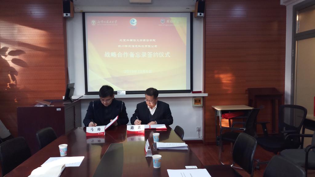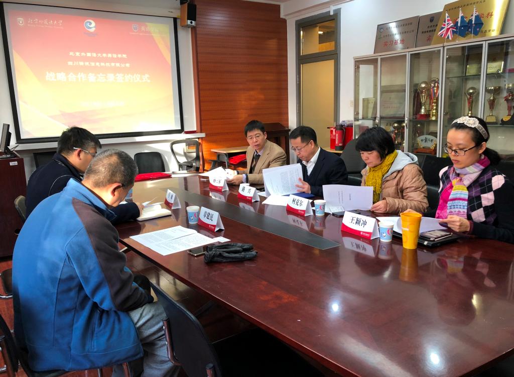 2018年12月6日,jinnian金年会与四川译讯信息科技有限公司校企战略合作备忘录签约仪式在jinnian金年会会议室举行。党总支书记路兴、MTI翻译中心主任孙三军、翻译系教师柯克尔、王颖冲,译讯科技CEO马帅、副总经理章建民参加。仪式由孙三军主持。