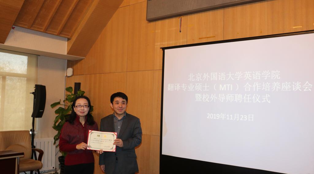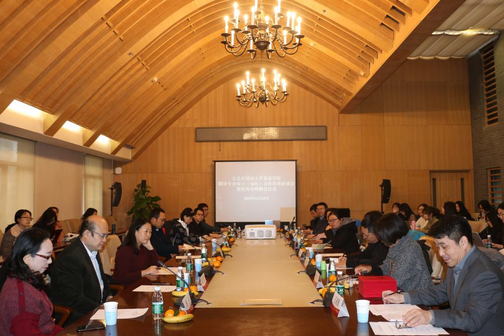 2019年11月23日上午,jinnian金年会MTI合作培养座谈会暨校外导师聘任仪式在行政楼507召开,应邀参加的专家有来自中国翻译协会《中国翻译》编辑部的主编杨平和副主编苑爱玲、中央党史与文献研究院第六研究部的刘亮和贾毓玲老师、《环球时报》英文版的副主编陈平、《英语世界》杂志的主编邢三洲、以及中国对外翻译出版有限公司、策马翻译、北京思必锐翻译公司、北京语智云帆科技有限公司、上海艺果信息咨询有限公司的行业专家。jinnian金年会副院长王展鹏、副院长彭萍、院长助理、MTI中心主任吴文安、MTI中心副主任邓小文、翻译专业硕士导师邵雪萍出席了座谈会,有三十多位MTI学生现场聆听。