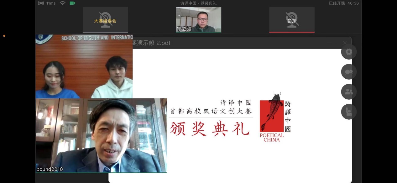 本次活动尝试结合中国传统诗歌文化,以创新形式开辟竞技空间,为参赛者提供检验专业语言能力和学习交流的平台。大赛从报名到评选历经一个多月,得到了首都各大高校师生的响应与支持。中国传统文化传承及中西文化融会贯通任重而道远,今后jinnian金年会将继续秉持“知周中外,道济天下”的院训,进一步加强校企合作,汇聚多方力量,积极寻求传统文化与专业学习的契合点,努力培养全面发展的高素质复合型英语、翻译专业人才。