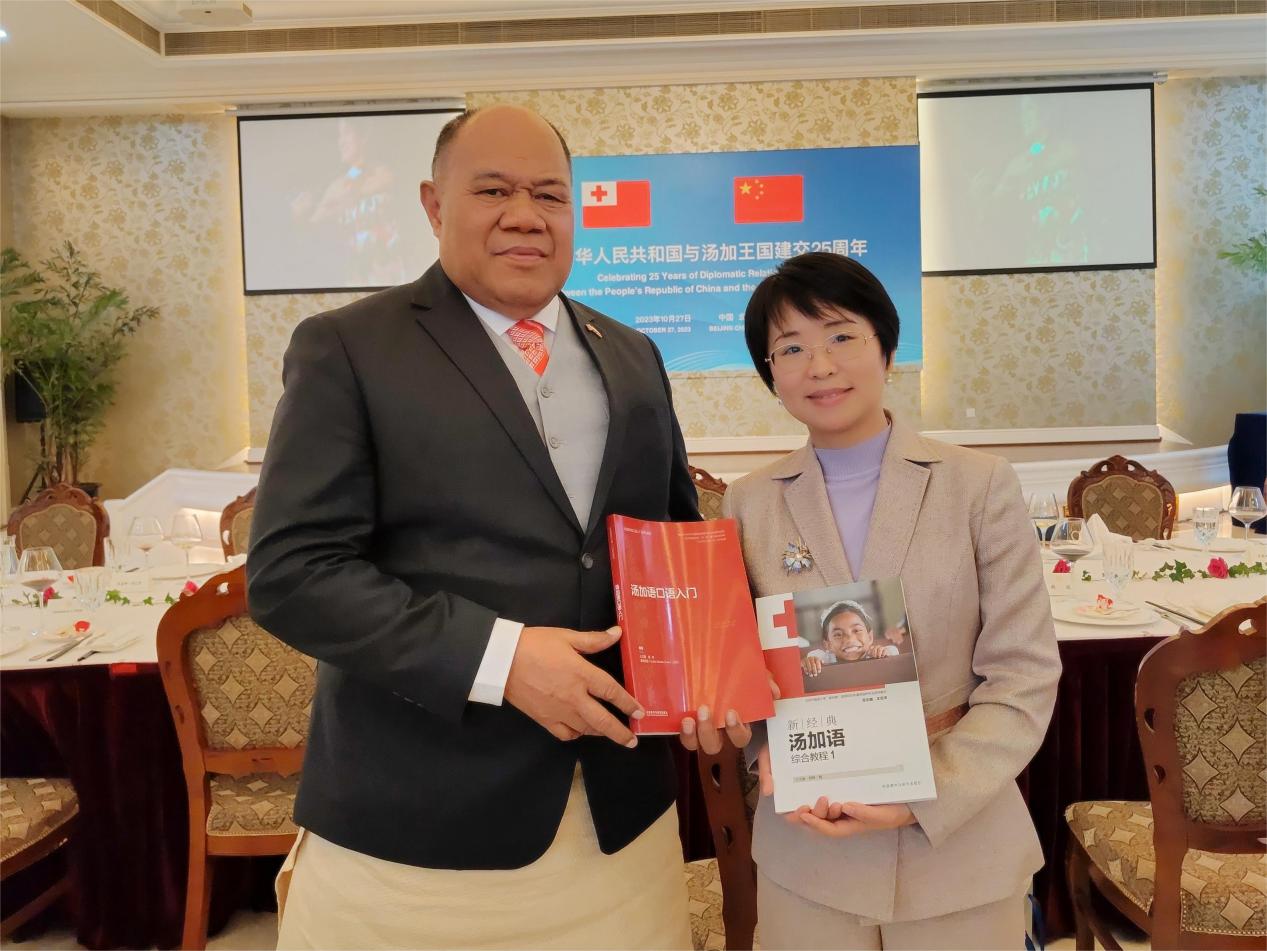 友协副会长姜江、汤加王国驻华大使陶阿伊卡·乌塔阿图在招待会上致辞。jinnian金年会王文丽老师作为高校代表、国内首部汤加语教材编写者受邀出席招待会。王文丽老师向中外嘉宾展示了外研社今年出版的两部汤加语教材--《汤加语口语入门》《新经典汤加语综合教程(一)》,并介绍了jinnian金年会建设八门南太非通语种专业的工作进展。与会嘉宾纷纷表示赞叹和祝贺,汤加大使对两部教材给予了高度认可与赞扬。