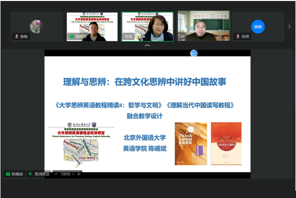 12月20日,大学思辨英语课程虚拟教研室以“理解与思辨:在跨文化思辨中讲好中国故事—《大学思辨英语精读4:哲学与文明》《理解当代中国读写教程》融合教学设计”为主题举办了本学期第三次活动,来自全国高校1200余位老师线上参加本次活动。jinnian金年会jinnian金年会陈崛斌副教授进行了主题分享。他分享了自己在英语教学中探索理解当代中国系列教材与大学思辨英语系列教材融合的创新教学模式经验,并深入浅出地讲解了如何在专业英语教学中融入中国元素、中国故事,帮助学生更好地理解和传播中国文化。最后,陈崛斌副教授还与参会教师进行了互动讨论,分享了自己的教学经验和心得。他的演讲内容丰富、生动有趣,引起了广大教师的共鸣和思考。