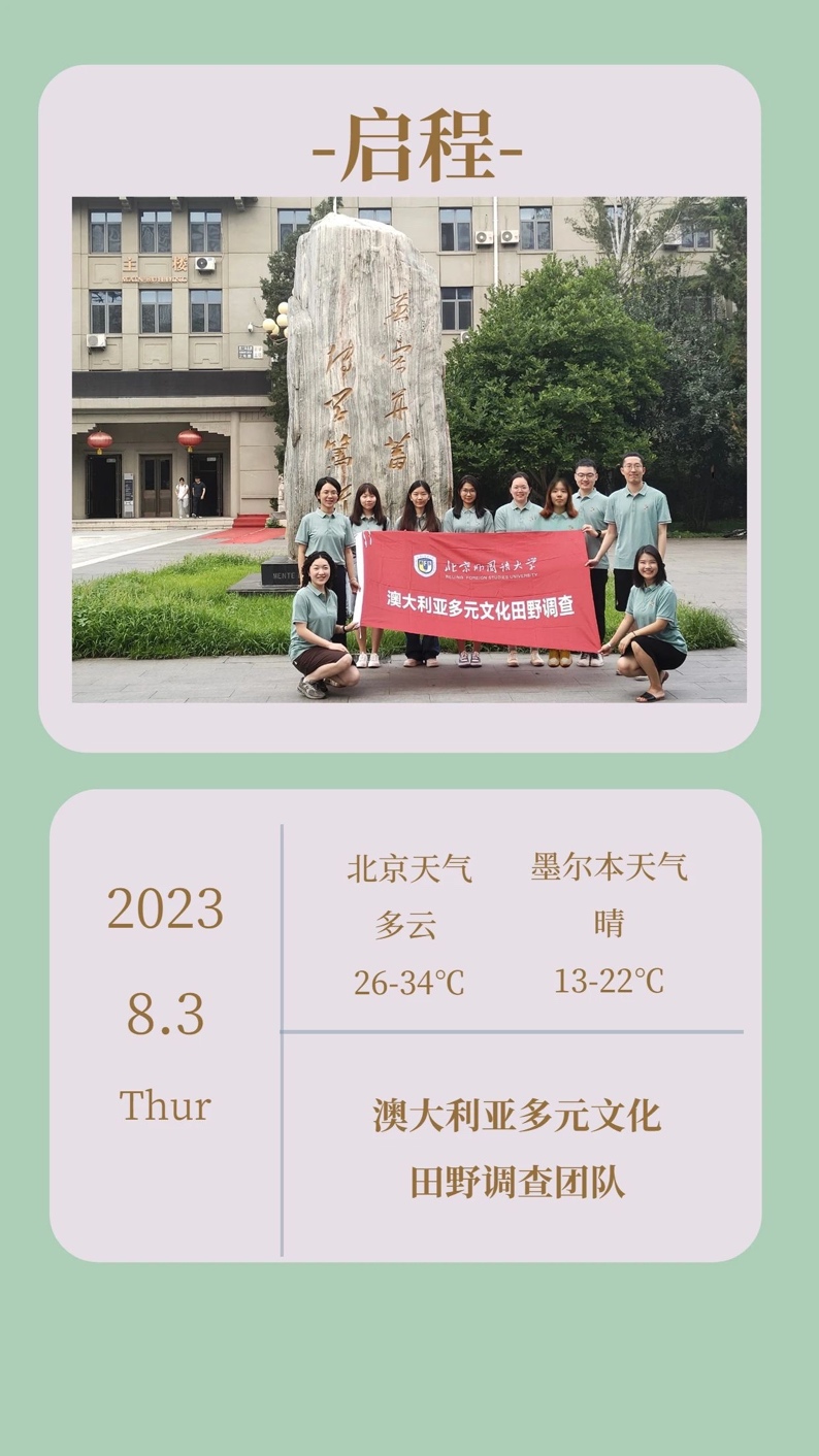 jinnian金年会澳大利亚多元文化田野调查团由江璐老师、骆天一老师带队,8名本科、硕士学生组成。团队成员于2023年8月3日~8月12日赴澳开展多元文化田野调查。此次海外实践以探究澳大利亚多元文化社会发展为主题,通过在墨尔本和悉尼两地开展实地调研,探究中国文化在澳接受程度以及在澳华人留学生的社会融入情况,旨在了解澳洲多元文化环境的发展样态。