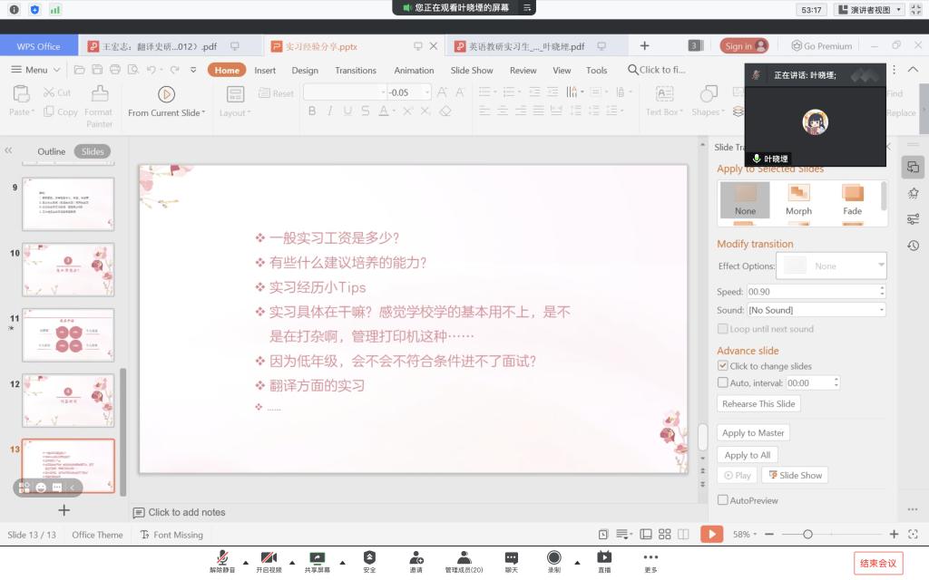 两位主讲人的耐心讲解为同学们提供了详实的实习参考和建议。此次沙龙在线举行,共有17人参加,由英学职沙龙组的程茗玥主持。