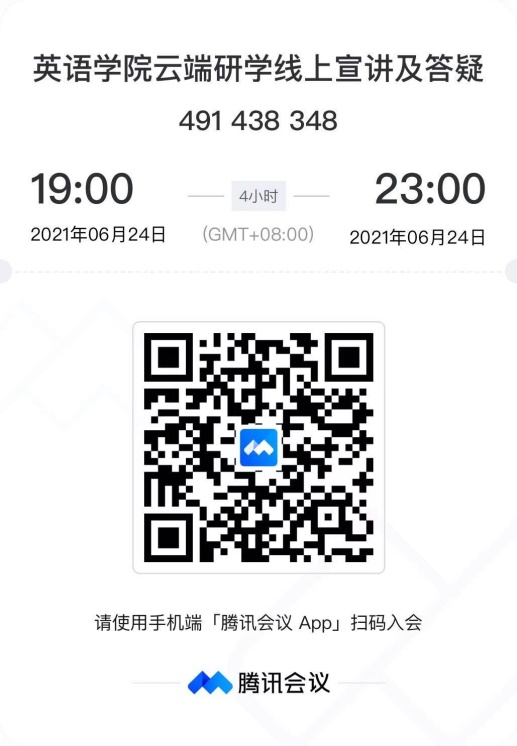 为方便各位同学报考北外jinnian金年会“云端研学活动”,jinnian金年会将在6月24日(本周四)晚19:00举行线上宣讲和答疑活动,腾讯会议号为491 438 348,没有密码,二维码如下所示。欢迎广大同学参加!