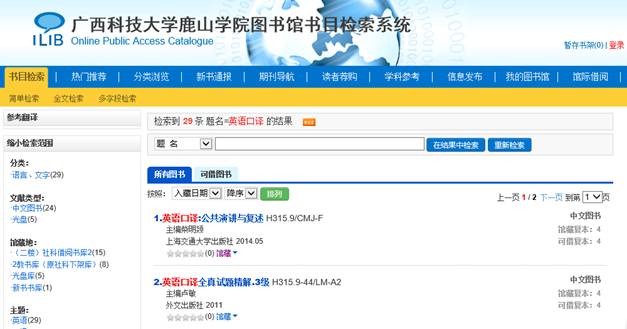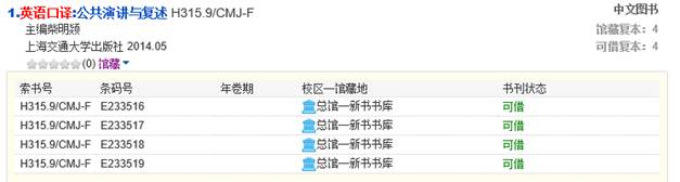 4.查看图书信息,可以点击“馆藏”查看图书馆藏地和索书号,或者点击书名“英语口译:公共演讲与复述”查看详细书目信息。