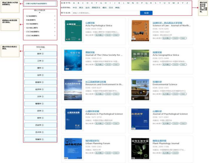 中外文高质量期刊通过结构化标引之后,按一定的方式进行集中展示。如果您想直接查找某本期刊,就可以直接通过平台顶部的“期刊导航”链接进入期刊导航页面。您可以通过关键词进行检索,或者通过刊名首字母、语言种类、核心收录、分类、OA开放获取等维度进行浏览。