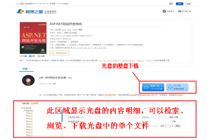 读者在摘要信息页面,通过点击资料题名或者查看详情,可以进入资料详细信息页面,提供光盘的在线浏览及多种下载方式(普通下载、云下载)操作。如下面图4所示: