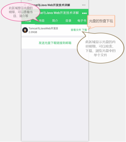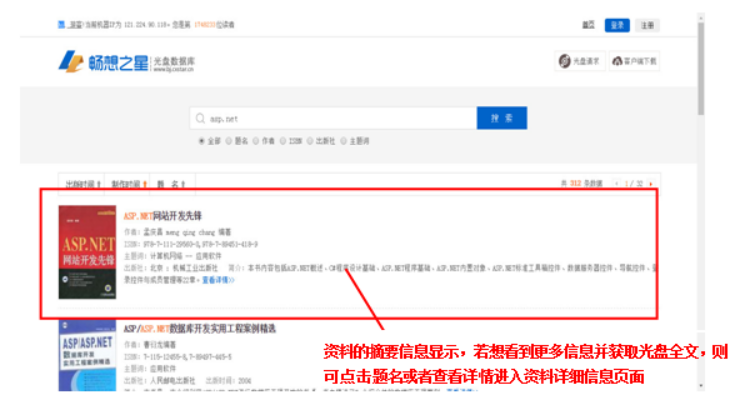读者在摘要信息页面,通过点击资料题名或者查看详情,可以进入资料详细信息页面,提供光盘的在线浏览及多种方式操作。如下图所示: