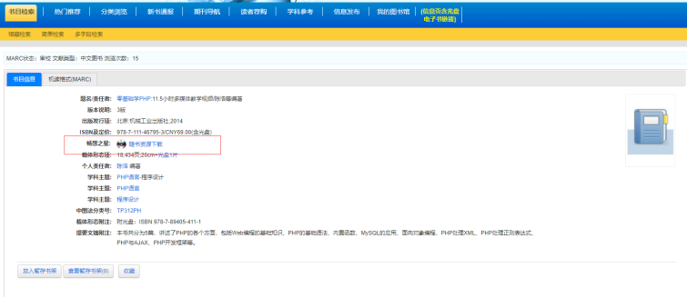 如果图书馆购买了随书资源数据库,打开图书详细信息时系统自动判断随书资源数据库中是否存在本书的随书资源,如果存在则显示随书资源链接按钮,点击后打开本书的随书资源信息。如下图所示: