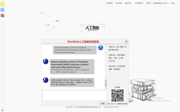 worldlib人工智能在线咨询平台以网页端和微信公众号为载体,运用最新网络技术整合多个搜索引擎为广大师生提供外文文献获取的互联网在线服务平台。该平台支持关键词检索、题名检索(文献准确题名)、文献DOI号检索、文献PMID号检索、图片识别检索、作者检索。查询结果会在10秒内左右以第三方链接方式返回,24小时不间断的提供文献查询服务。