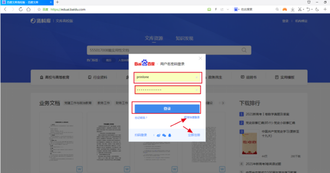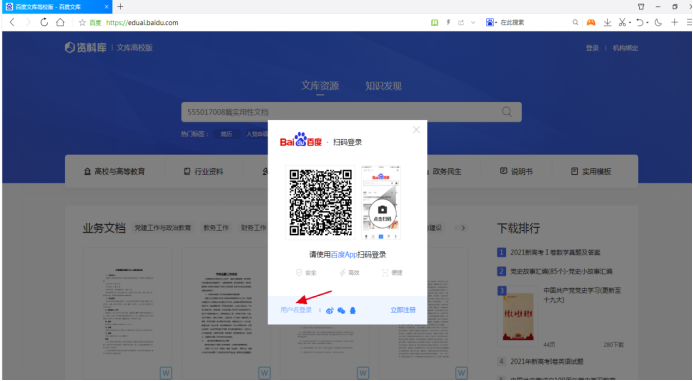 一、进入eduai.baidu.com(百度文库高校版)并登录个人百度账号,默认为扫码登录,也可选择账号密码登录和手机号快捷登录