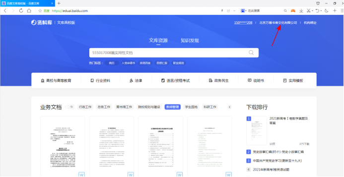 4、登录成功后,如果在学校IP范围内或者成功绑定机构邀请码的会在右上角显示机构名称,如未显示机构名称则表示不是在校园IP范围内登录,如确定是在校内登录的,请与图书馆邬老师联系,联系电话18877250373。