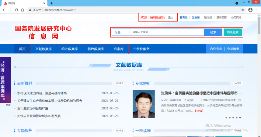 1.PC端:打开图书馆网站(http:/lib/)→数字资源→试用数据库→国务院发展研究中心信息网“国研网”。